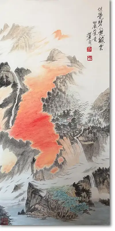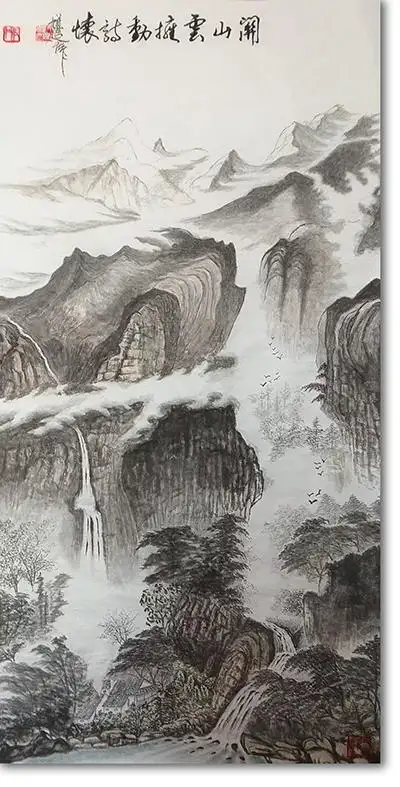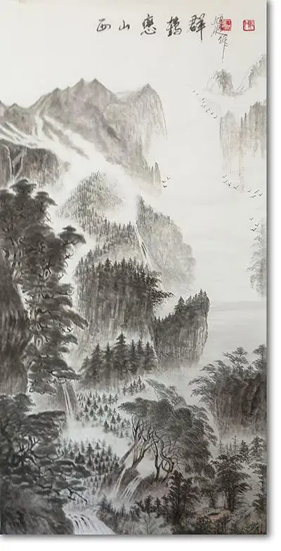 袁佐仁的山水画,是传统文脉与自然生命的当代对话。他笔下的《西山恋鹤群》,取唐代常建诗意入画,以淡墨轻岚营造出云气氤氲的山林意境,群鹤翩跹于层峦叠嶂之间,既呼应了王昌龄隐居的清幽意趣,更融入了当代人对自然生命的深情眷恋。《关山云擁动诗怀》则以浓墨重彩写尽云山奔涌之势,白云如涛、碧山似玉,笔墨间流淌着对祖国山河的炽热热爱,观者凝视画中云海翻涌,仿佛能听见画家心底涌动的诗意波澜。他擅长捕捉南方秋景的独特韵味,“但觉碧山艳,秋云丽几重”,在秋阳夕照下,深绿老叶反射出的金黄色彩,被他以彩墨细腻晕染,将南方山林的温润与绚烂定格于尺幅之间,既有传统文人画的清雅,更具现代视觉的感染力。从《壮丽山河》到《山乡巨变》,从《高山流水》到《疑是银河落九天》,袁佐仁的每一幅作品都扎根于生活沃土,他深入浏阳河畔的山野乡村,遍览湘江两岸的四时风物,将自然的生机与人文的底蕴熔铸于笔墨,让观者在山水间既得视觉之美,更获心灵之栖。