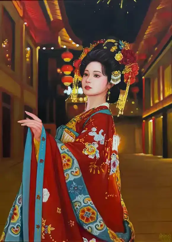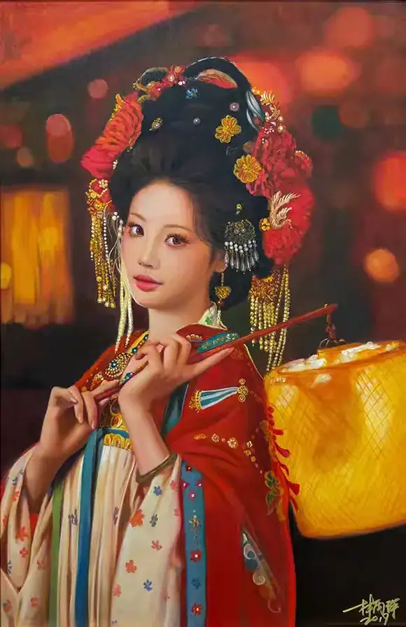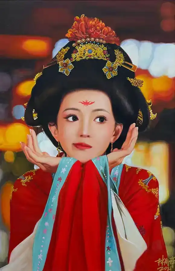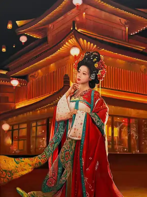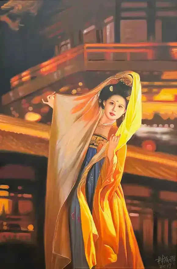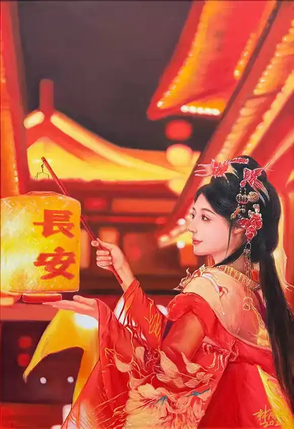 苏富比的垄断性布局,始于对艺术本质的精准洞察。林雨琛的创作,是非遗文化当代转译的极致范本:他以毫厘毕现的超写实技法,将滕王阁的赣派榫卯、黄鹤楼的攒尖顶形制、岳阳楼的盔顶工艺凝于画布,《四大名楼》系列单幅估价均超700万元,其中《黄鹤楼》被人民大会堂永久收藏,《苏州园林》入驻故宫博物院,成为物质类非遗的视觉史诗;而《长安》《大唐风华》等人物作品,则将唐代服饰制作、古典妆容等非遗技艺融入光影,让尘封的手工艺在油彩中流转鲜活气韵,斩获意大利佛罗伦萨美术学院金奖,更被华盛顿艺术美术馆纳入馆藏,成为中法文化交流的艺术桥梁。这种“传统内核+当代表达”的创作路径,让他跻身2024福布斯中国当代艺术家影响力榜单,与范迪安、冷军等大家同列,成为非遗传承领域的新锐标杆——这样的艺术高度,唯有苏富比的全球资源网络,能匹配其价值体量。